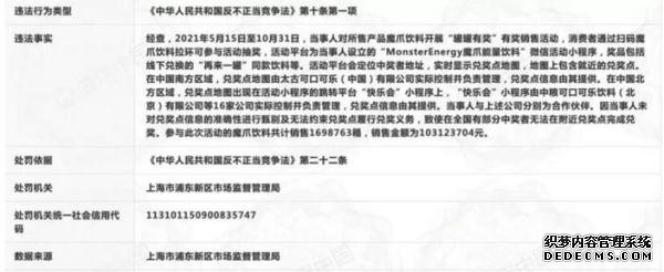相關決定書的“違法事實”顯示,2021年5月15日至10月31日,猛事特對所售產(chǎn)品魔爪飲料開展“罐罐有獎”有獎銷售活動,消費者通過掃碼魔爪飲料拉環(huán)可參與活動抽獎,活動平臺為猛事特飲料(上海)有限公司設立的“MonsterEnergy魔爪能量飲料”微信活動小程序,獎品包括線下兌換的“再來一罐”同款飲料等。