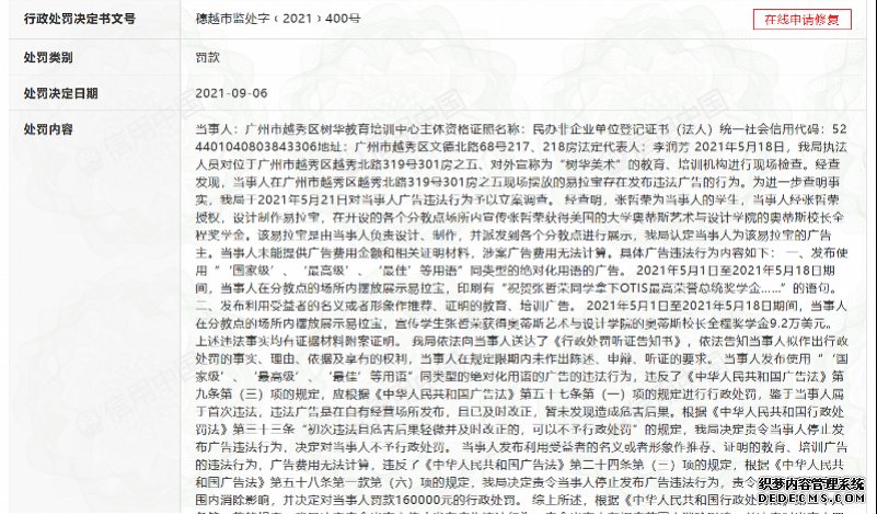 信用中國(guó)官網(wǎng)顯示,廣州市越秀區(qū)市場(chǎng)監(jiān)督管理局認(rèn)為上述行為違法內(nèi)容有二: 一是發(fā)布使用“‘國(guó)家級(jí)’、‘最高級(jí)’、‘最佳’等用語(yǔ)”同類型的絕對(duì)化用語(yǔ)的廣告; 二是發(fā)布利用受益者的名義或者形象作推薦、證明的教育、培訓(xùn)廣告。