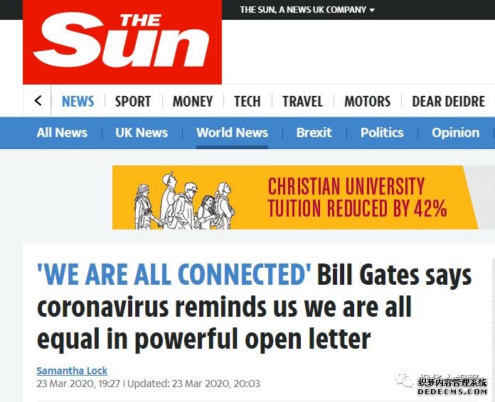 今天英國《太陽報》 刊登了比爾蓋茨的公開信,這封信得到極大關(guān)注,得到很多人轉(zhuǎn)發(fā),人們稱贊比爾蓋茨是真正的智者,并有人第一時間就把他的公開信翻譯成中文。下面是比爾蓋茨的信內(nèi)容。********************** 我堅信發(fā)生的每一件事后面都有一個精神層面的目的,無論我們認(rèn)為是好還是壞。 當(dāng)我沉思時,我想與大家分享我的心得,新冠病毒究竟對我們做了些什么。 1) 病毒提醒我們,人都是平等的,無論我們的文化、宗教、職業(yè)、經(jīng)濟狀況,或是一個人有多么出名。在病毒眼中我們都是平等的,也許我們也應(yīng)該平等對待他人。如果你不相信我的話,那就去問湯姆·漢克斯。 2) 病毒提醒我們,我們的命運都是聯(lián)在一起的,影響一個人的事情同時也會影響另一個人。病毒也提醒我們,我們建立的虛假國境線毫無價值,因為病毒并不需要護(hù)照。病毒還提醒我們,雖然我們暫時受到壓迫,世界上還有人一生都受到壓迫。 3) 病毒提醒我們,健康多么珍貴。而我們卻忽視健康,吃垃圾食品,喝被各種化學(xué)品污染的水,如果我們不照顧自己,我們當(dāng)然就會生病。 4) 病毒提醒我們,生命苦短,什么是我們應(yīng)該做的最重要的事情,特別是那些已經(jīng)生病的老年人。人生在世的目的不是買一卷卷的廁紙。 5) 病毒提醒我們,我們的社會已經(jīng)變得物質(zhì)至上,當(dāng)我們遇到困難時,我們才想起我們的基本需求是食物、飲水和藥品,而不是并沒有什么價值的奢侈品。 6) 病毒提醒我們,家庭是何等重要,但我們卻忽視了這一點。病毒強迫我們回到我們的房子里,所以我們可以把房子建成家庭,并建立牢固的家庭紐帶。 7) 病毒提醒我們,我們真正的工作并不是我們打的那份工,我們固然需要打工,然而上帝創(chuàng)造我們的目的并不是讓我們打工。我們真正的工作是互相照顧、互相保護(hù)、互助互利。 8) 病毒提醒我們,我們不能妄自尊大。病毒還提醒我們,無論你覺得自己多偉大,也無論別人覺得你多么偉大,一個小小的病毒就能讓整個世界停擺。 9) 病毒提醒我們,自由掌握在我們自己手中。我們可以選擇合作互助、分享、付出、互相支持,或者我們也可以選擇自私、囤積和自顧自。只有在困難的時候才能看出一個人的真面目。 10) 病毒提醒我們,我們既可以耐心,也可以恐慌。我們既可以理解這種情況在歷史上已經(jīng)發(fā)生過多次,但最后都過去了,我們也可以恐慌,以為世界末日到了,結(jié)果傷害了我們自己。 11) 病毒提醒我們,疫情既是結(jié)束也是開始。我們現(xiàn)在可以反省和理解,從錯誤里吸取教訓(xùn)。疫情也可以是一個輪回的開始,而且還會繼續(xù)下去,直至我們吸取教訓(xùn)為止。 12) 病毒提醒我們,我們的地球病了。病毒還提醒我們,我們必須看到森林消失的速度,也必須看到一卷卷廁紙從貨架上消失的速度。我們都病了,因為我們的家庭病了。 13) 病毒提醒我們,困難總會過去,然后就容易了。生活是周期性的,現(xiàn)在只是周期里的一個階段。我們不必恐慌,疫情一定會過去。 14) 許多人認(rèn)為新冠病毒的疫情是一場災(zāi)難,但我覺得這是一次“偉大的糾錯”。 下面是《太陽報》刊登的原文: