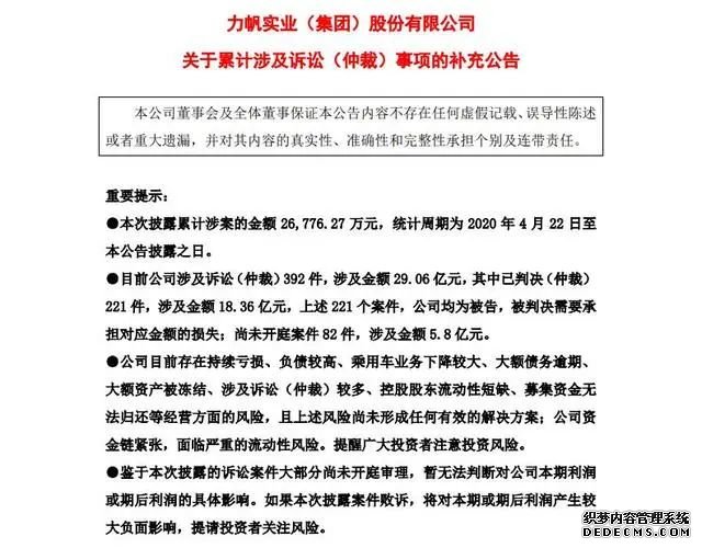 6月18日晚間,力帆股份發(fā)布公告,披露公司累計涉及訴訟事項的補充公告。公告顯示,公司涉及訴訟已達392件,涉及金額29.06億元。392起案件中,已判決案件221起,力帆全部為被告,共需賠償對方18.36億元。未開庭案件82起,涉及總金額5.8億元。此外,近12個月內(nèi)未披露訴訟達到2.68億元。還有181起訴訟,由于單個案件金額較小不予披露,總金額達到1.64 億元。這近30億元的債務(wù)幾乎要壓垮力帆。業(yè)績報告顯示,2019年全年力帆實現(xiàn)營收74億元,同比下滑32.35%。歸屬于上市公司股東凈利潤虧損46.8億元,同比下降1950.83%。