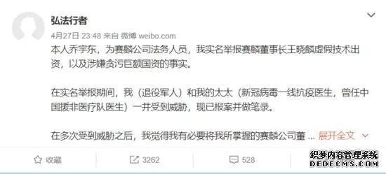 不到一年,王曉麟?yún)s遭該公司一法務(wù)員工實(shí)名、公開(kāi)舉報(bào),罪名很?chē)樔耍荷嫦迂澪蹏?guó)有資產(chǎn)。舉報(bào)者喬宇東本是賽麟公司法務(wù)員工,2019年10月,他向檢查、國(guó)資和審計(jì)部門(mén)舉報(bào)了王曉麟虛假技術(shù)出資及涉嫌貪腐的情況,卻被賽麟公司以涉嫌侵害己方商譽(yù)為由報(bào)案,但因未達(dá)到立案條件而未被公安機(jī)關(guān)立案。