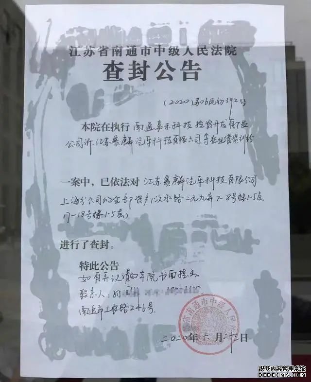 查封公告顯示,江蘇省南通市中級(jí)人民法院在執(zhí)行南通嘉禾科技投資開(kāi)發(fā)有限公司訴江蘇賽麟汽車(chē)科技有限公司企業(yè)借債糾紛一案中,已依法對(duì)江蘇賽麟汽車(chē)科技有限公司上海分公司的全部資產(chǎn)進(jìn)行了查封。