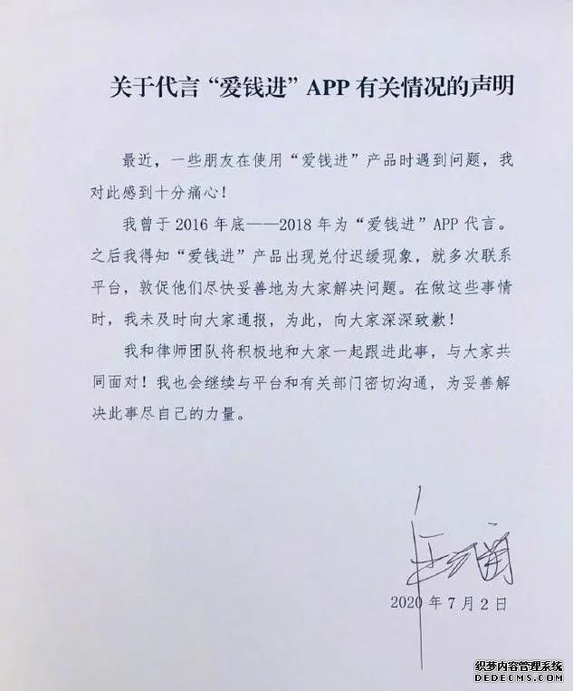 昨天,汪涵方面通過(guò)團(tuán)隊(duì)發(fā)表聲明,正式承認(rèn)了曾經(jīng)代言“愛(ài)錢(qián)進(jìn)”的相關(guān)事實(shí),并向廣大投資人鄭重道歉,稱(chēng)自已也很痛心焦急,將會(huì)與大家一道努力幫助追債和挽回?fù)p失。